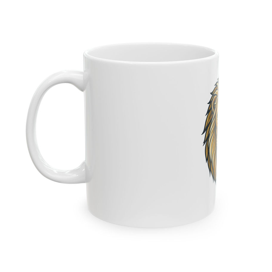 Start your morning with a steady, confident presence. This glossy ceramic mug bears a finely detailed lion illustration — warm golds and deep lines that feel both bold and calm. It sits heavy enough to feel dependable in your hand, the comfortable C-handle made for slow sips and deliberate moments. Use it at your desk while planning the day, on a quiet weekend porch, or as a ritual before early runs and late-night study sessions. The image holds its color wash after wash, so the lion keeps looking sharp through daily use. It’s for anyone who wants a small, steady reminder to move through the day with courage and focus.