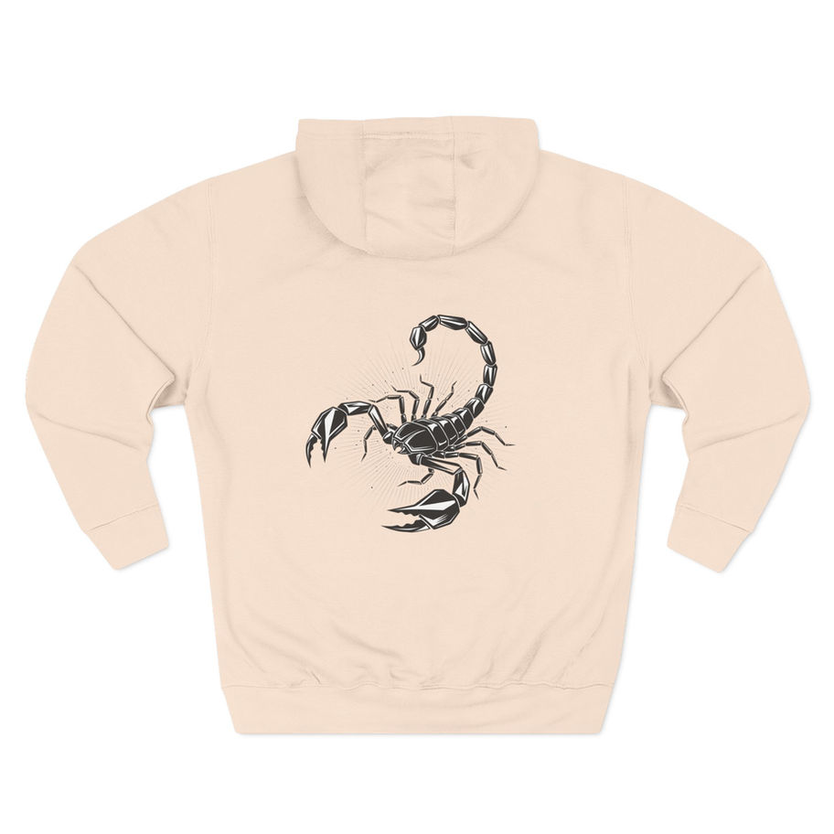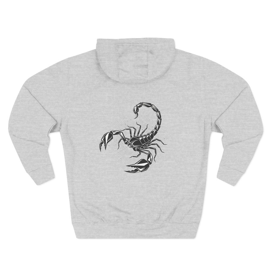 A midweight three-panel fleece hoodie built for everyday wear and effortless layering. The soft, combed ring-spun cotton face and plush 3-end fleece interior feel gentle against skin while holding shape through washing. The hood is adjustable with matching drawcords and metal grommets; a twill neck tape and double-needle topstitching reinforce stress points for lasting comfort. A roomy kangaroo pouch keeps hands warm and holds essentials. The clean back showcases a bold scorpion illustration for a subtle edge, while optional left- or center-chest embroidery lets you add a personal touch. With a regular fit and minimal shrinkage, this hoodie wears true to size and moves with you from cool mornings to late nights.